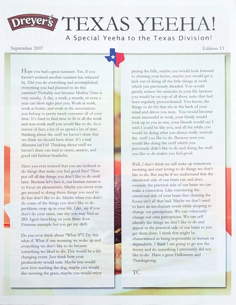 When I worked at Dreyer’s Grand Ice Cream from 2006 to 2008 at their local Houston office, I was asked to take over the division newsletter. I fully redesigned the newsletter and owned the editorial content.