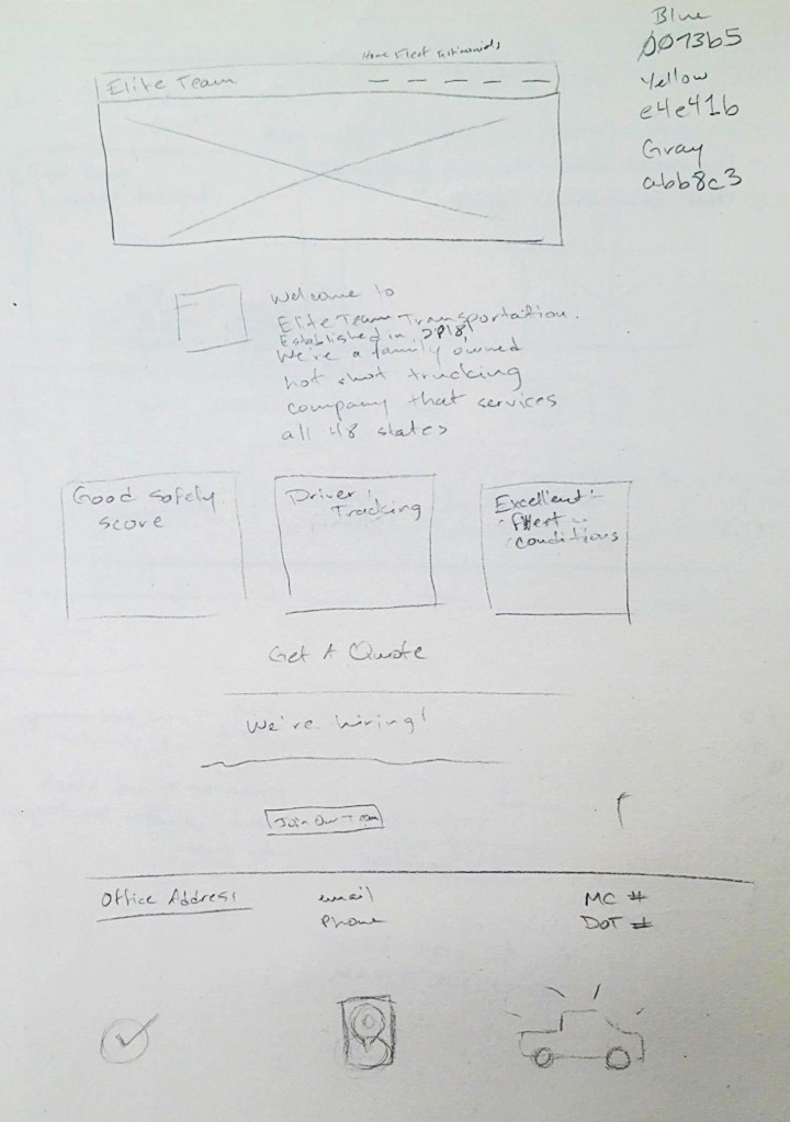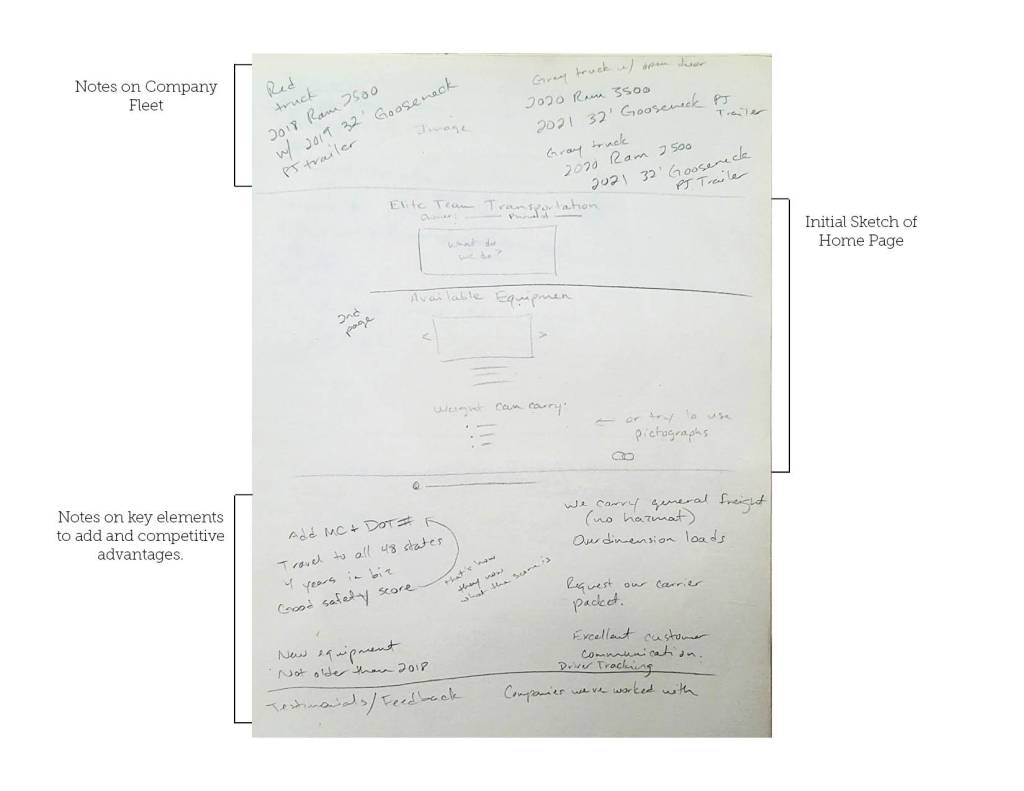 Notes were taken on equipment and terminology used in the hot shot trucking industry. Together, we outlined the competitive advantages, and I drew out a preliminary sketch of the home page.