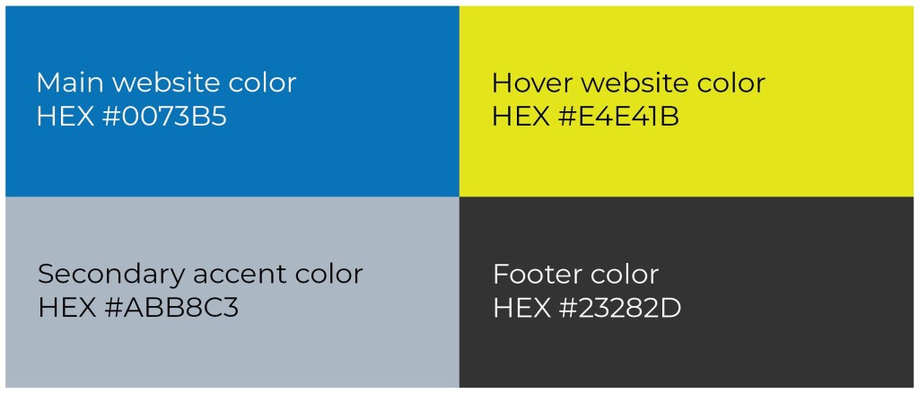 For the website colors, I chose 3 to keep the layout simple. The primary color would be a dark blue since research showed that blue can represent reliability. Yellow and gray colors were selected as accents for callout boxes or hyperlink selections.